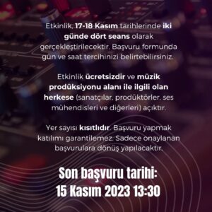 Uzamsal sesi gerçek bir stüdyo ortamında deneyimlemek ve bu alana nasıl adım atacağınızı öğrenmek için sizi 17-18 Kasım’da Bilkent Üniversitesi, İletişim ve Tasarımı Bölümü’ne davet ediyoruz.