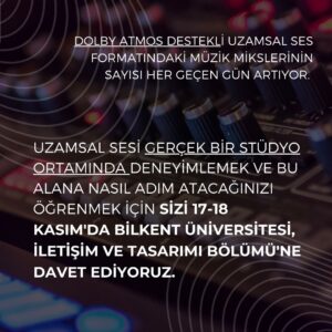 Uzamsal sesi gerçek bir stüdyo ortamında deneyimlemek ve bu alana nasıl adım atacağınızı öğrenmek için sizi 17-18 Kasım’da Bilkent Üniversitesi, İletişim ve Tasarımı Bölümü’ne davet ediyoruz.