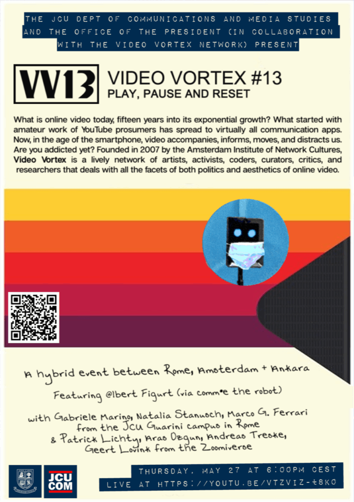 To compensate for the real life events that we are all missing so much, the VideoVortex community gathers during a hybrid event that happens both online and in the courtyard of John Cabot University in Rome. Organized and hosted by Donatella Della Ratta and Albert Figurt (in Rome) and Andreas Treske and Geert Lovink (online), we will switch between a conversation robot, Zoom, a drone and the obligatory online video screening in an experimental setup that will try to beat the overall online fatigue. Remember Malta, let’s bring on new VideoVortex gatherings! In the meanwhile, let’s preserve the spirit, see you all there